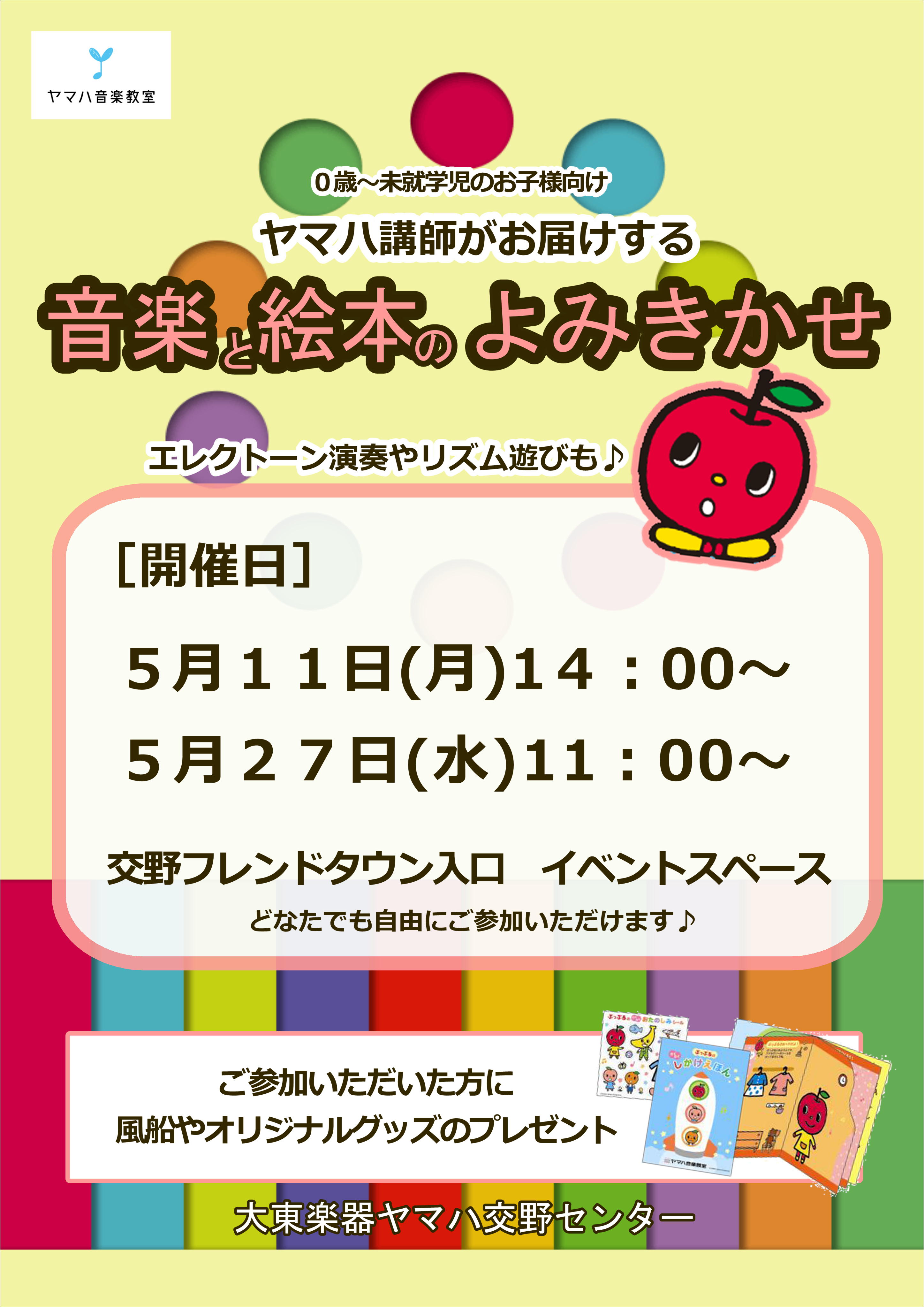 ニュース 一覧はこちら 2026年04月28日(火) イベントヤマハ「音楽と一緒に楽しむ絵本の読み聞かせ」 2026年04月28日(火) お知らせ5月11日(月) イベント開催時間のお詫びと訂正 2026年04月25日(土) イベント5月イベントカレンダー 2026年04月01日(水) お知らせ春の無料体験第2弾!(受付期間5/31(日)まで) 2026年04月01日(水) ショップ♪新学期一緒にスタート!セイハでみんな手をあげよう!♪